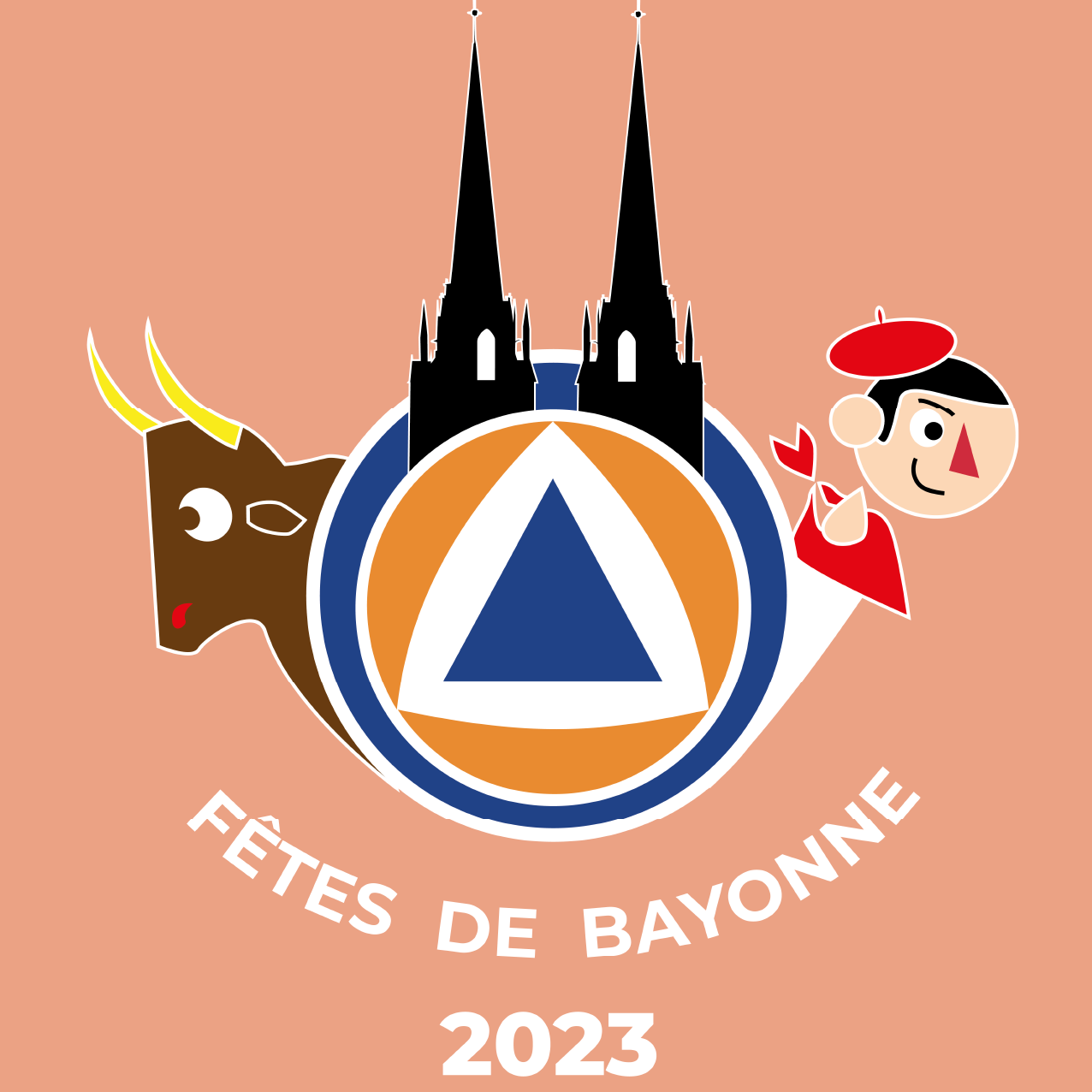 Conformément aux directives, le logo original de la Protection Civile demeure en première position. La Monstera, typographie emblématique de la Protection Civile, est utilisée pour le texte. La mention "Fêtes de Bayonne 2023" est également intégrée sous le blason.