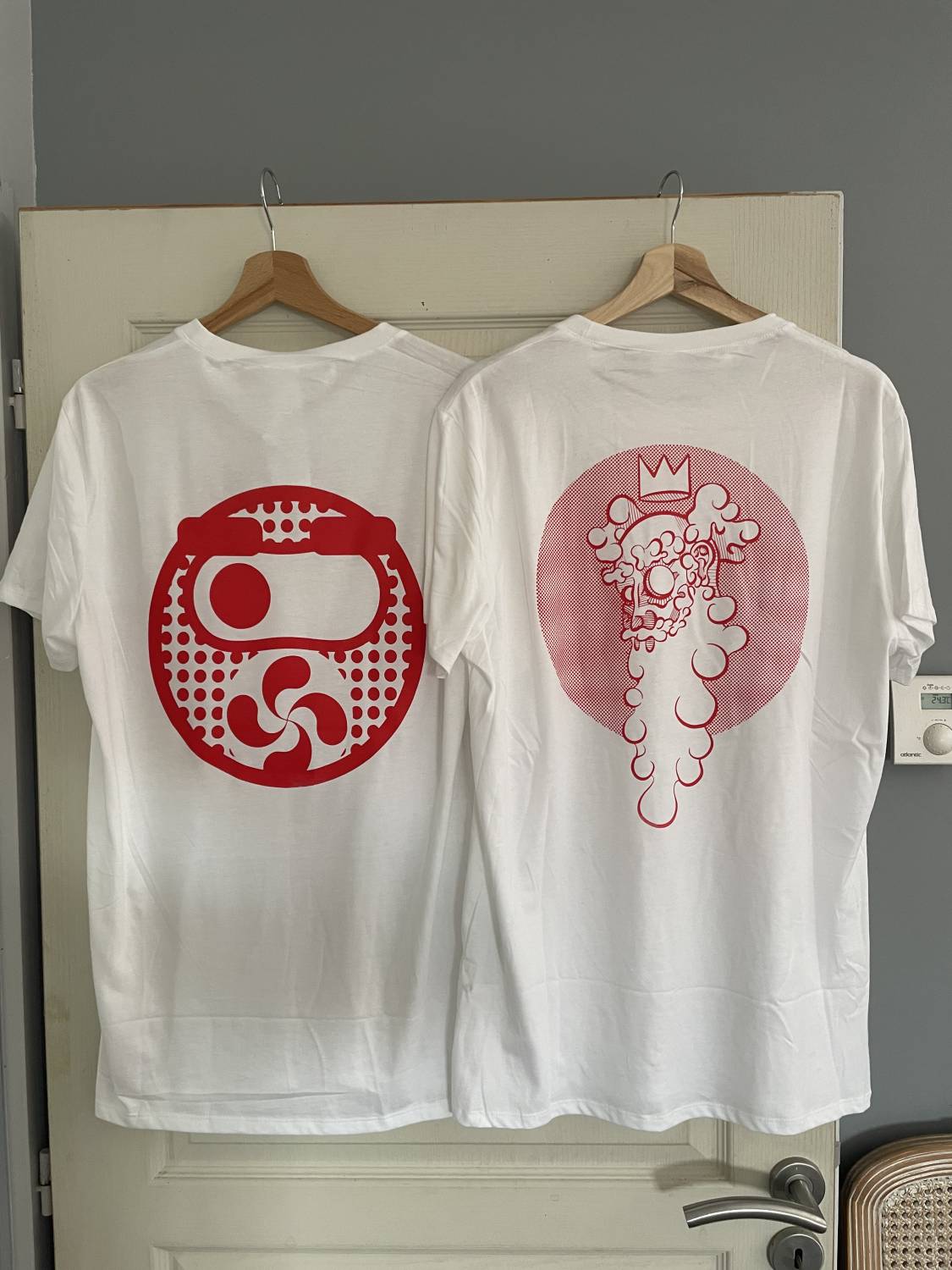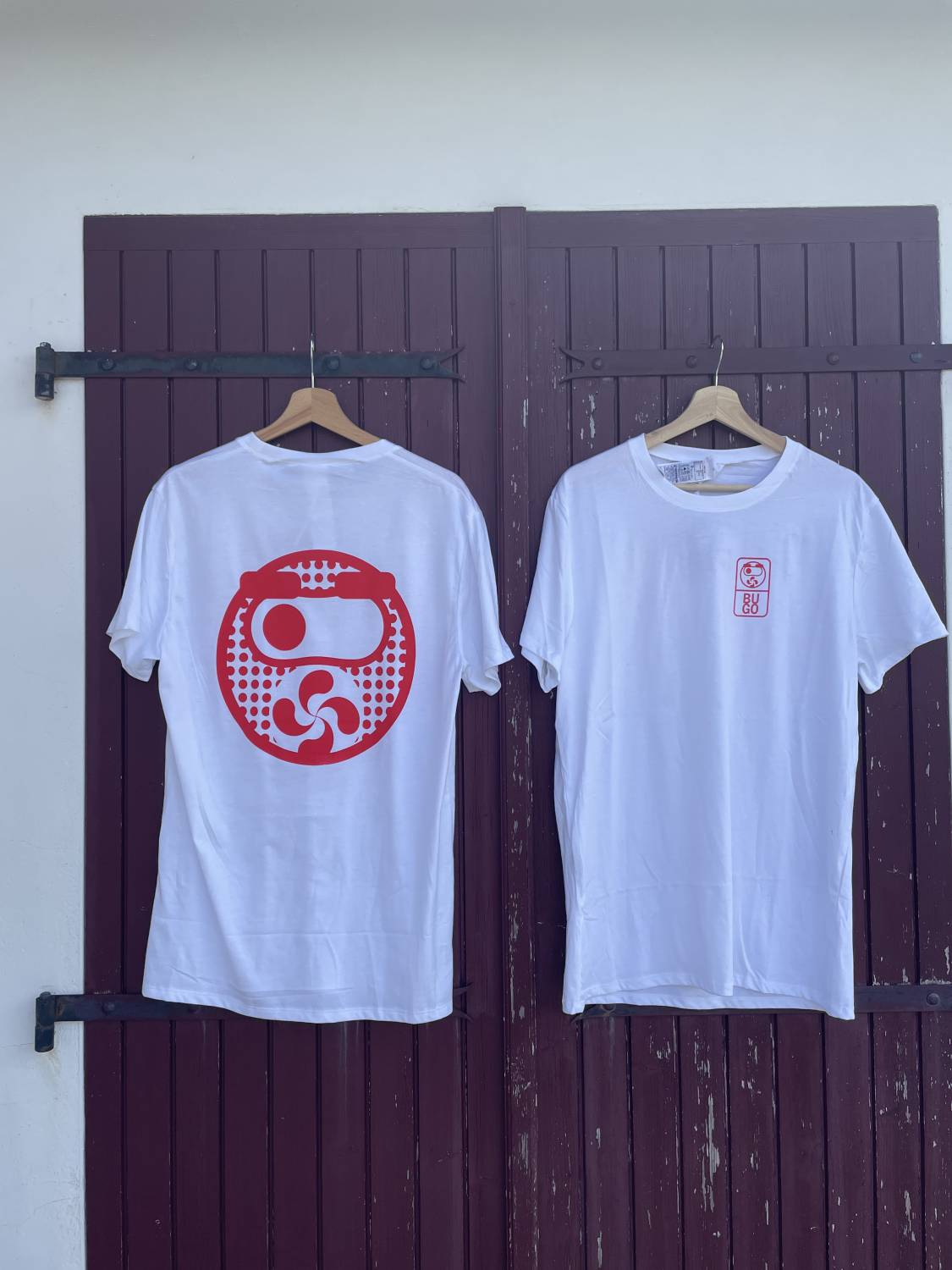 Deux visuels principaux ont été créés pour le dos des t-shirts, chacun représentant une version stylisée et expressive du Daruma, intégrant des éléments graphiques inspirés à la fois de l’iconographie japonaise et des motifs traditionnels basques. Le logo de la marque, plus minimaliste, est sérigraphié sur le cœur à l’avant du t-shirt. La palette rouge sur blanc reprend le code vestimentaire emblématique des fêtes de Bayonne, tout en renforçant la lisibilité et l’identité de la marque.